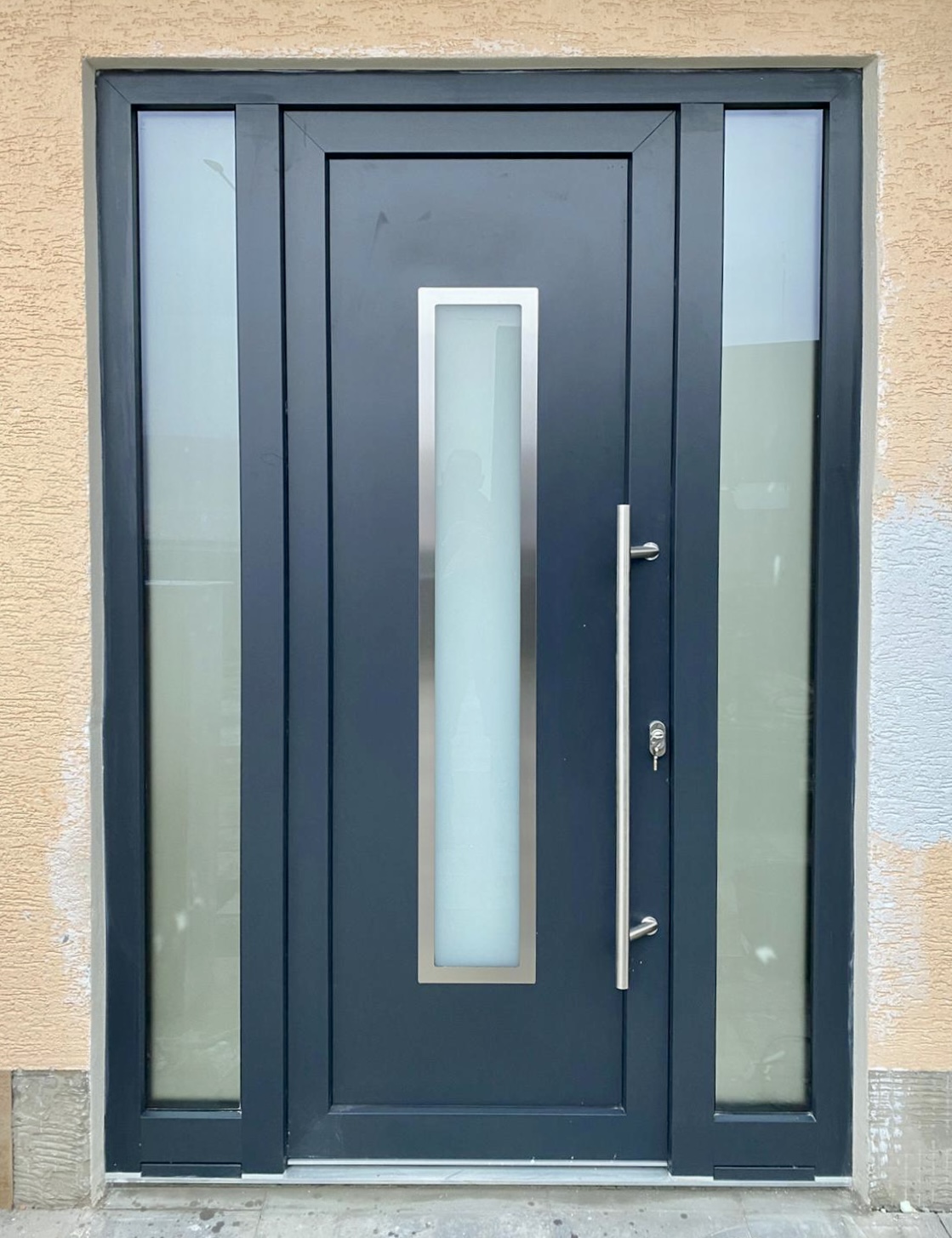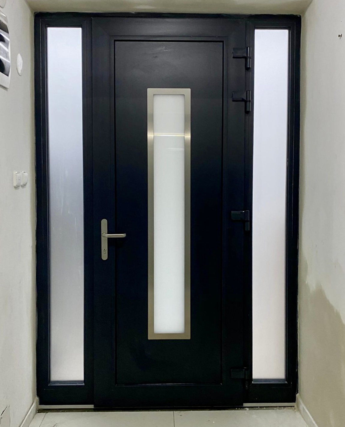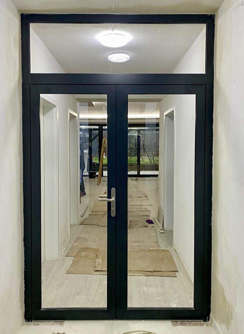 Dalším prvkem jsou celoprosklené dvoukřídlé dveře Aluprof MB-45 s nadsvětlíkem. Jedná se o odlehčený hliníkový systém s hloubkou rámu 45mm používaný v prostorách s minimálním požadavkem na tepelnou izolaci. Je vhodný např. do zádveří rodinných domů, nebo nejčastěji používaný do kanceláří a komerčních prostor. Tento systém je osazen bezpečnostním 6mm sklem, které lze dodat i v matném provedení, pro zachování potřebného soukromí.🤩 Bezpečnost zajišťuje vícebodový zámek, rovněž používaný u standardních vstupních dveří.