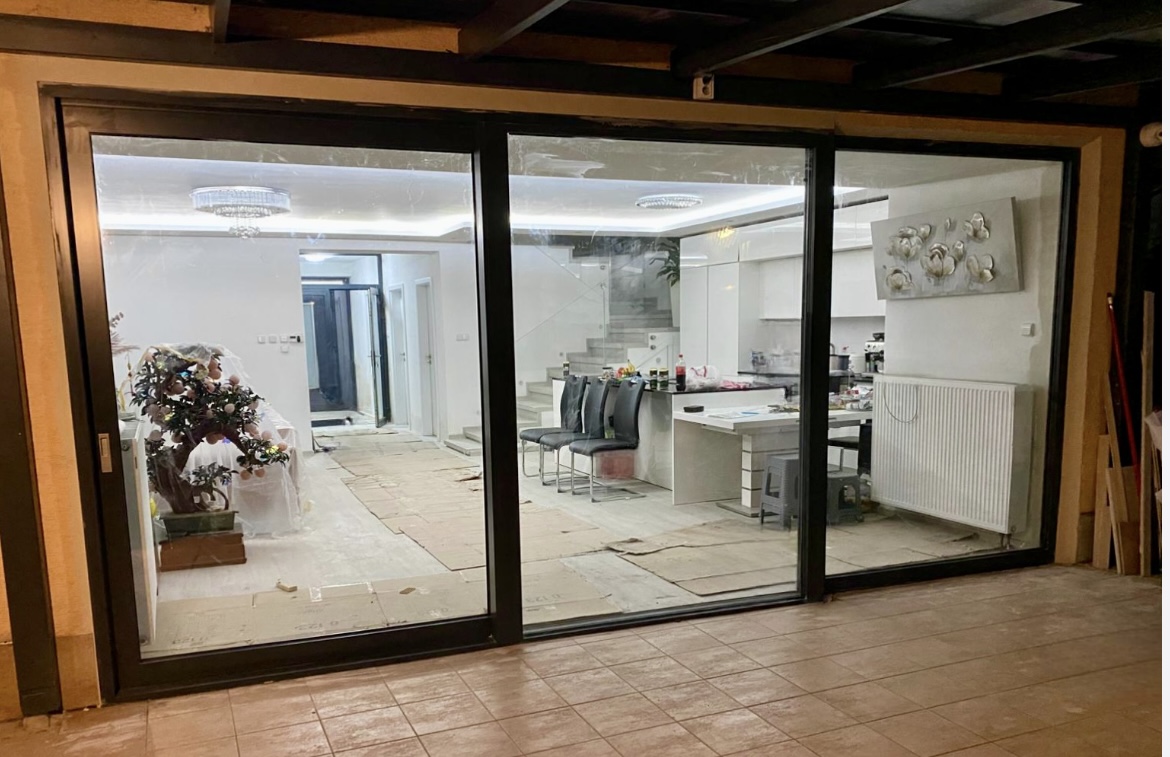 Představujeme Vám velmi specifickou realizaci, v jejímž rámci došlo ke kombinaci dvou materiálů a čtyř typů profilů.😉 Hliníková sestava Aluprof šířky 5100mm zajišťuje skvělý rozhled z interiéru a kombinuje rozměrné fixní okno Aluprof MB 86 SI a zdvižně-posuvný portál Aluprof MB-77HS v provedení Monorail, kdy fixní část skla sahá až k zemi.