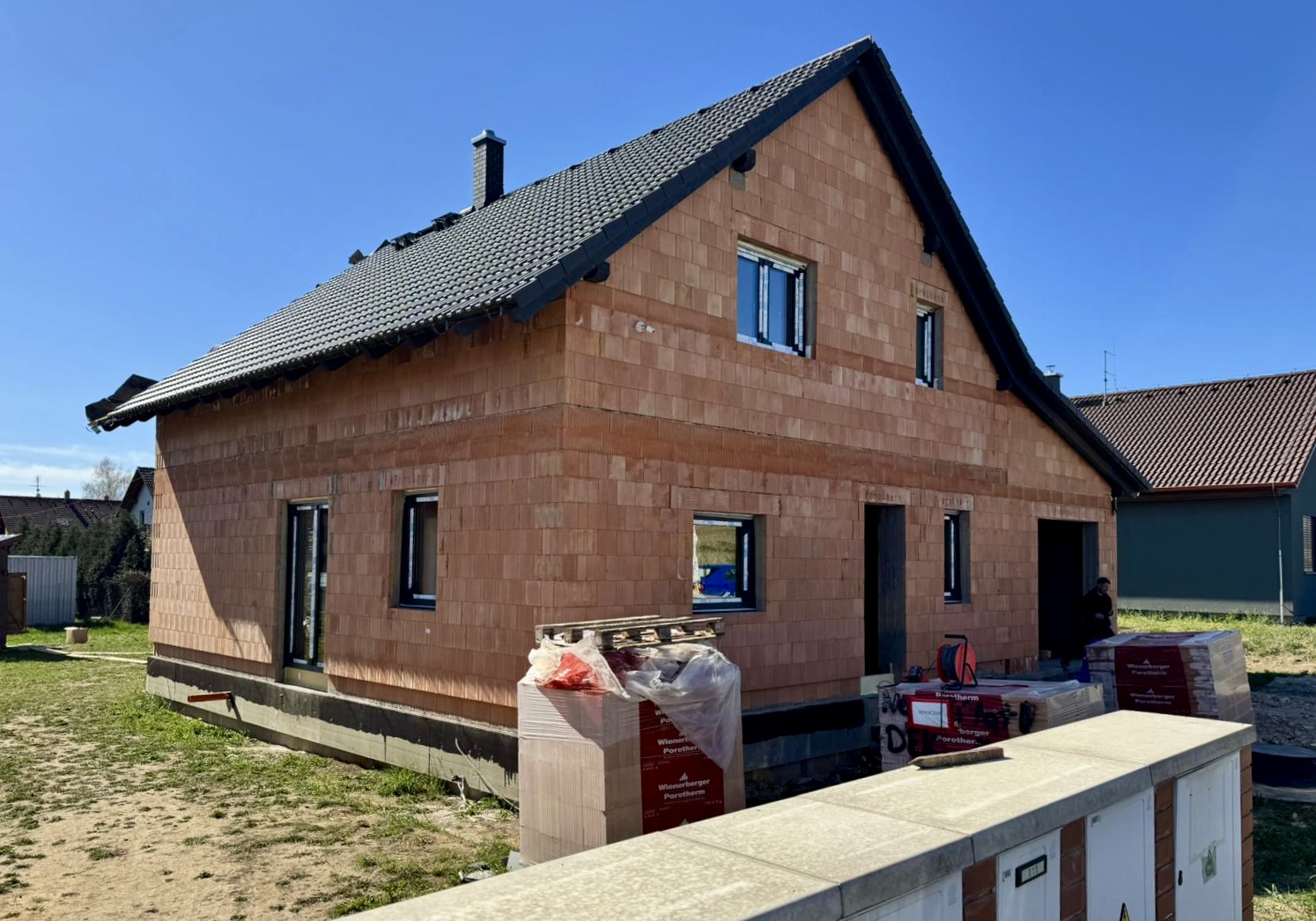 Klientova novostavba rodinného domu ve středočeském kraji je nově osazena plastovými okny Veka Softline se stavební hloubkou 82 mm se středovým těsněním, v kombinaci s hliníkovými dveřmi Aluprof MB 86 SI. Barevné provedení hladkého antracitu se příjemně vyjímá na všech pozicích a pozžitý neviditelný svár V-perfect zvyšuje pevnost sváru v rozích až o 25%.